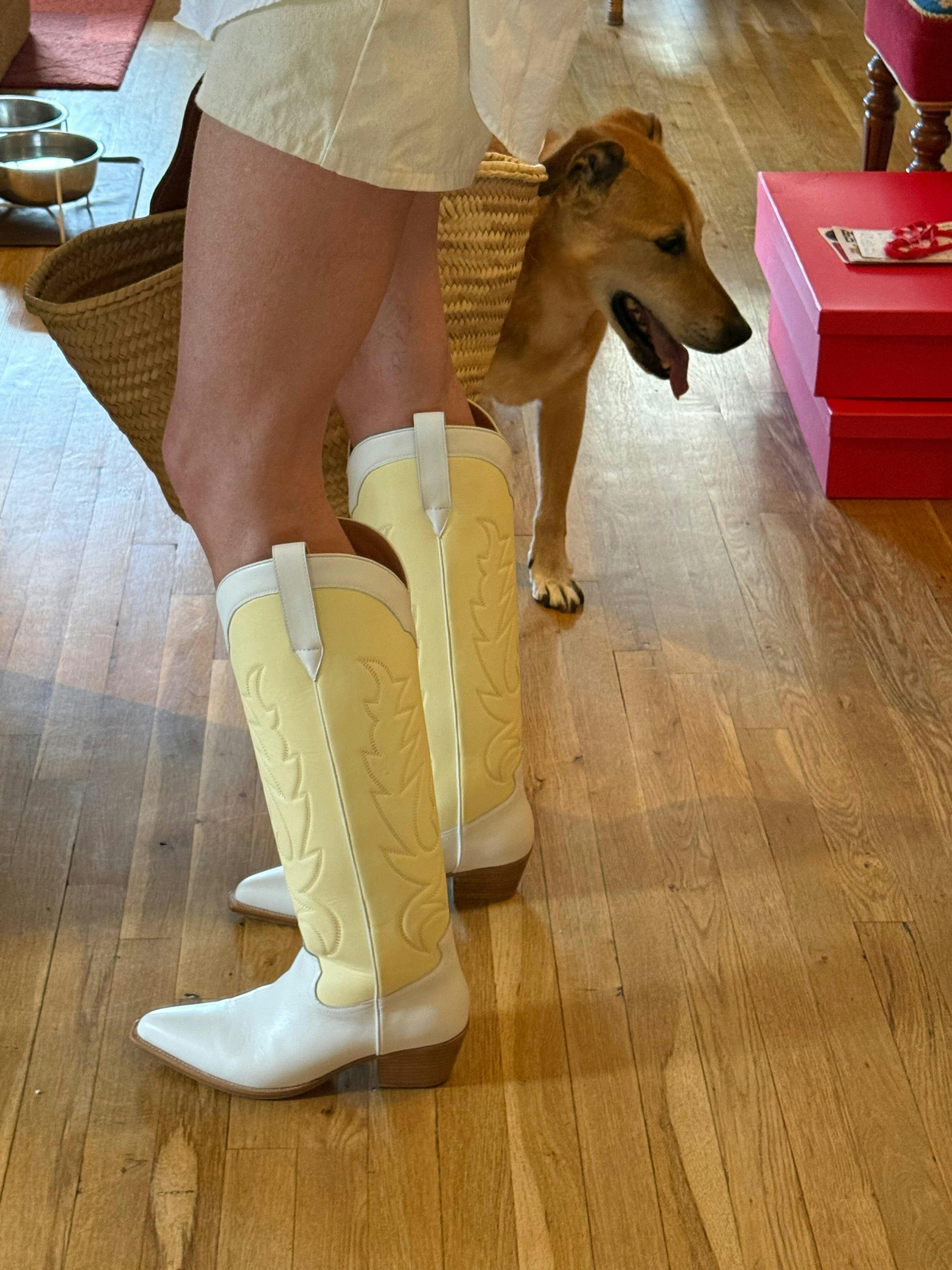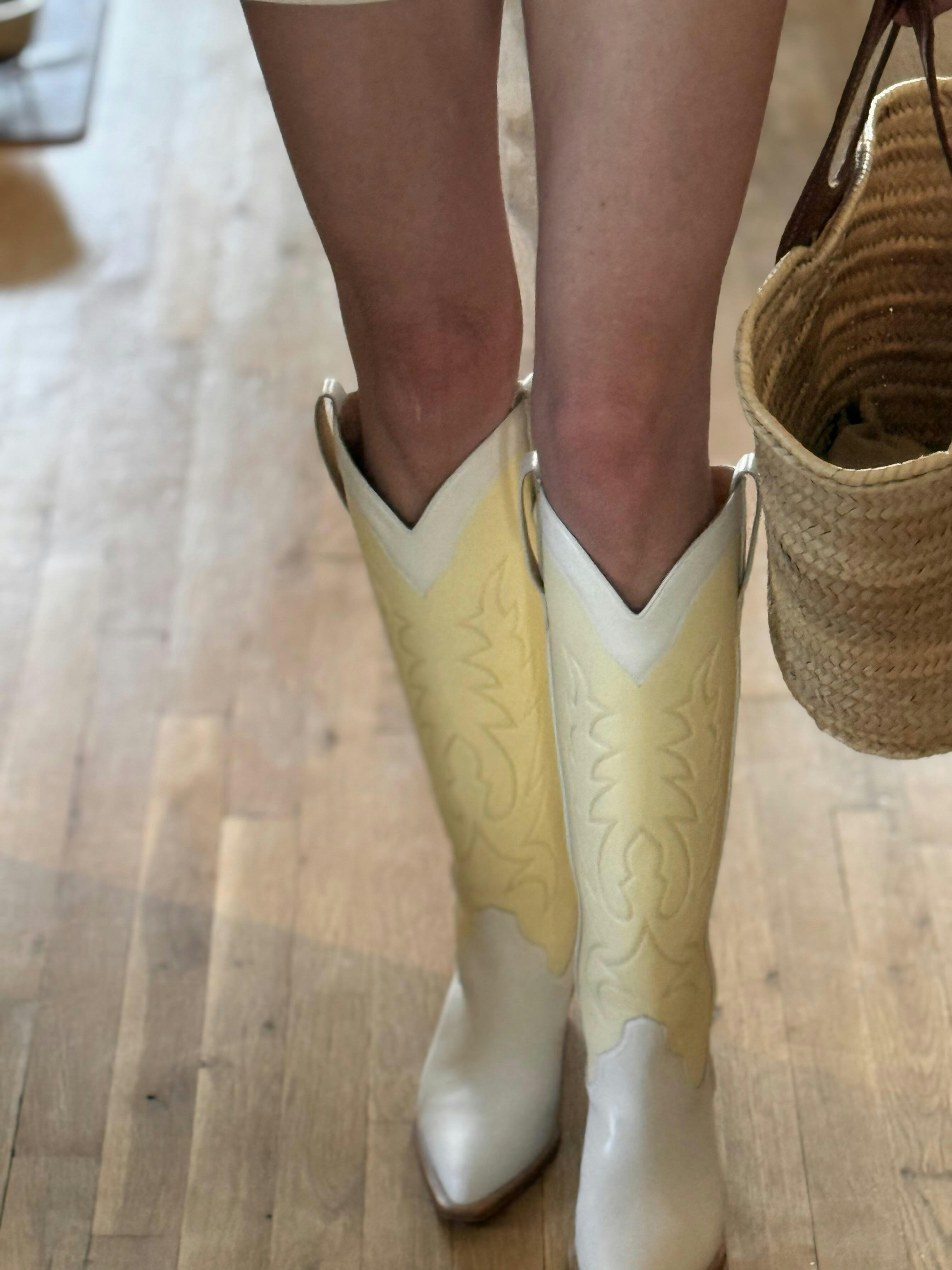 These bone and banana cowboy boots, crafted from buttery calf nappa, are cut just below the knee with classic pull tabs, an angled heel, and a sharp pointed toe. Signature embroidered panels nod to western tradition, reimagined city-ready style. Inside, a discreet credit-card-sized pocket is stitched into the lining - because utility is part of the story too.